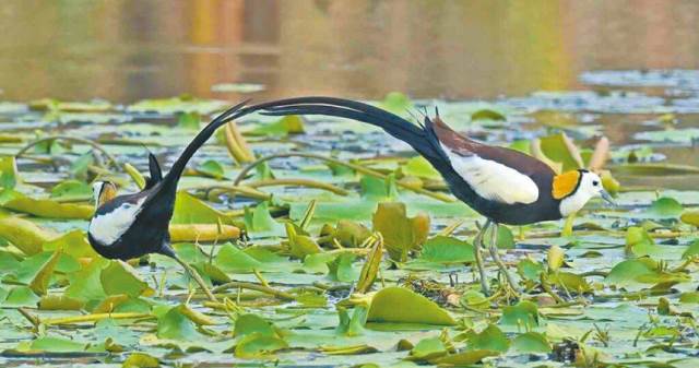 為營造水雉生活棲地,嘉義分署向農田水利署嘉南管理處認養嘉南埤圳國家級重要溼地,投入營造九芎埤,今年5月近50位志工,溼身在九芎埤種下2萬株印度莕菜及菱角,經過一段時間,浮葉植物開枝散葉,葉片相連形成一整片水雉可行走的「浮地」,成功復育出棲地。