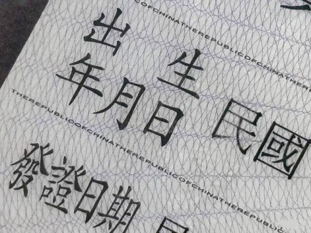中華民國國民身分證上每個欄位間的橫線其實是由連續的「THE REPUBLIC OF CHINA」微小字緊密排列所構成,具有防偽功能。(資料照)