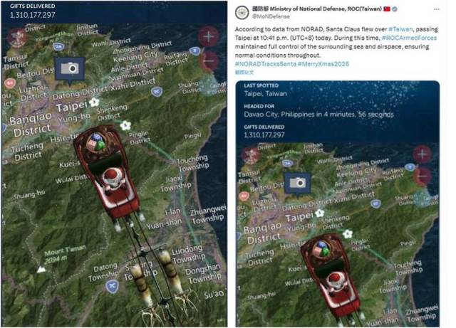<blockquote class="twitter-tweet"><p lang="en" dir="ltr">According to data from NORAD, Santa Claus flew over <a href="https://twitter.com/hashtag/Taiwan?src=hash&ref_src=twsrc%5Etfw">#Taiwan</a>, passing Taipei at 10:41 p.m. (UTC+8) today. During this time, <a href="https://twitter.com/hashtag/ROCArmedForces?src=hash&ref_src=twsrc%5Etfw">#ROCArmedForces</a> maintained full control of the surrounding sea and airspace, ensuring normal conditions throughout.<a href="https://twitter.com/hashtag/NORADTracksSanta?src=hash&ref_src=twsrc%5Etfw">#NORADTracksSanta</a> <a href="https://twitter.com/hashtag/MerryXmas2025?src=hash&ref_src=twsrc%5Etfw">#MerryXmas2025</a> <a href="https://t.co/ncwXbwhcbg">pic.twitter.com/ncwXbwhcbg</a></p>— 國防部 Ministry of National Defense, ROC(Taiwan) 🇹🇼 (@MoNDefense) <a href="https://twitter.com/MoNDefense/status/2003840959013159403?ref_src=twsrc%5Etfw">December 24, 2025</a></blockquote> <script async src="https://platform.twitter.com/widgets.js" charset="utf-8"></script>